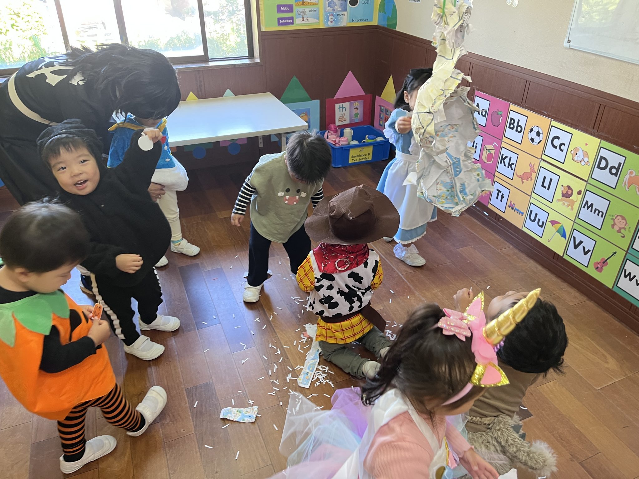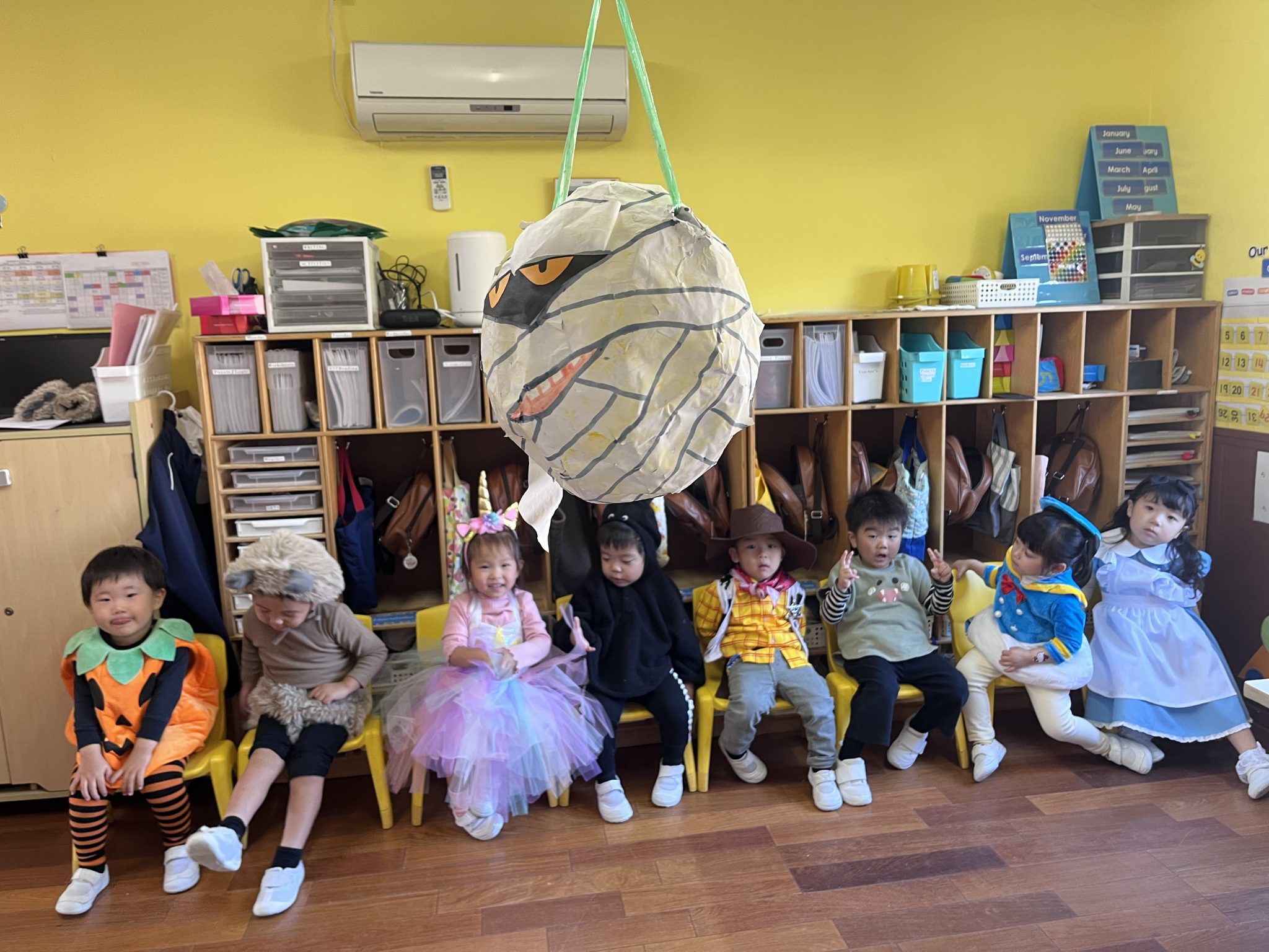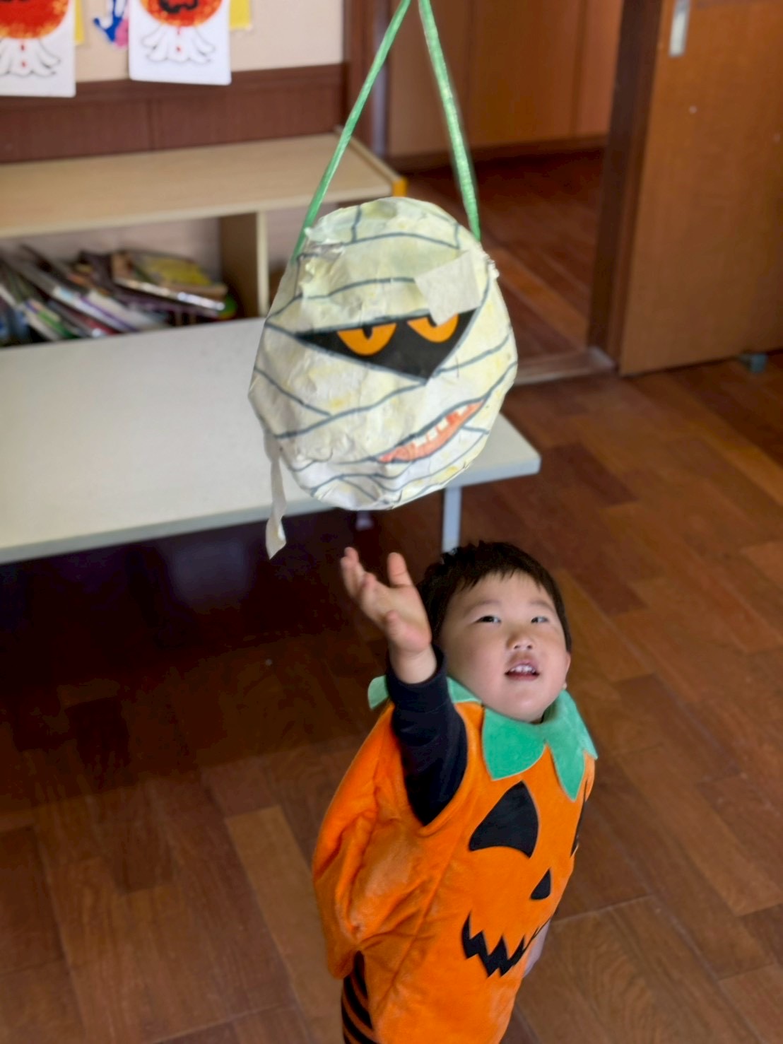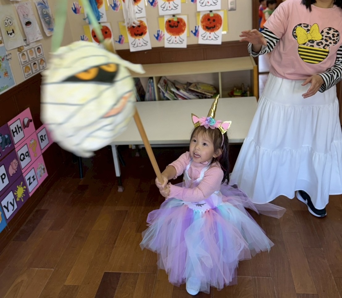 It was a successful Halloween party we had last week! We carved pumpkin jack-o’-lanterns with triangle eyes and made monster and pumpkin art. We had so much fun wearing our cute and BOOtiful costumes and playing lots of Halloween games.We also made it through the witch maze. It was scary at first, but we conquered it with the BBA.We even got stickers from the piñata mummy that we successfully broke, and of course, we brought home some Halloween sweets that we were so excited to eat!