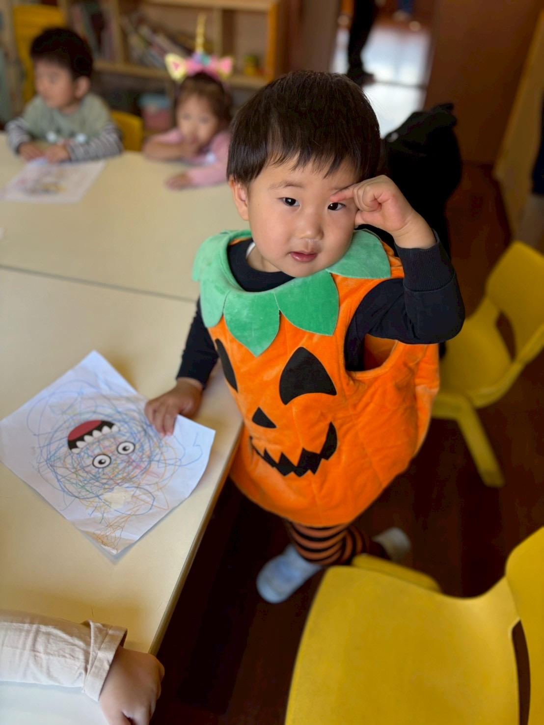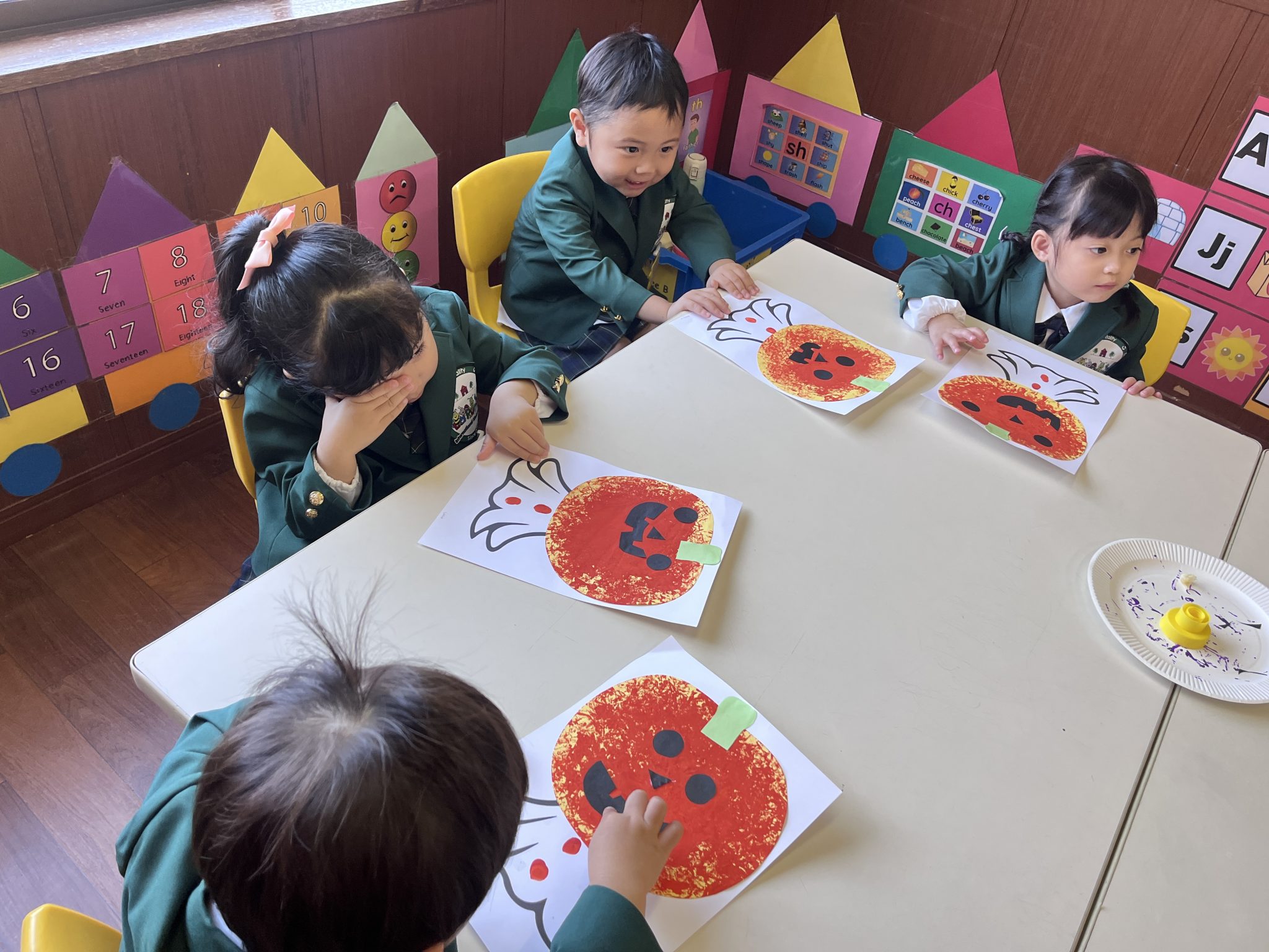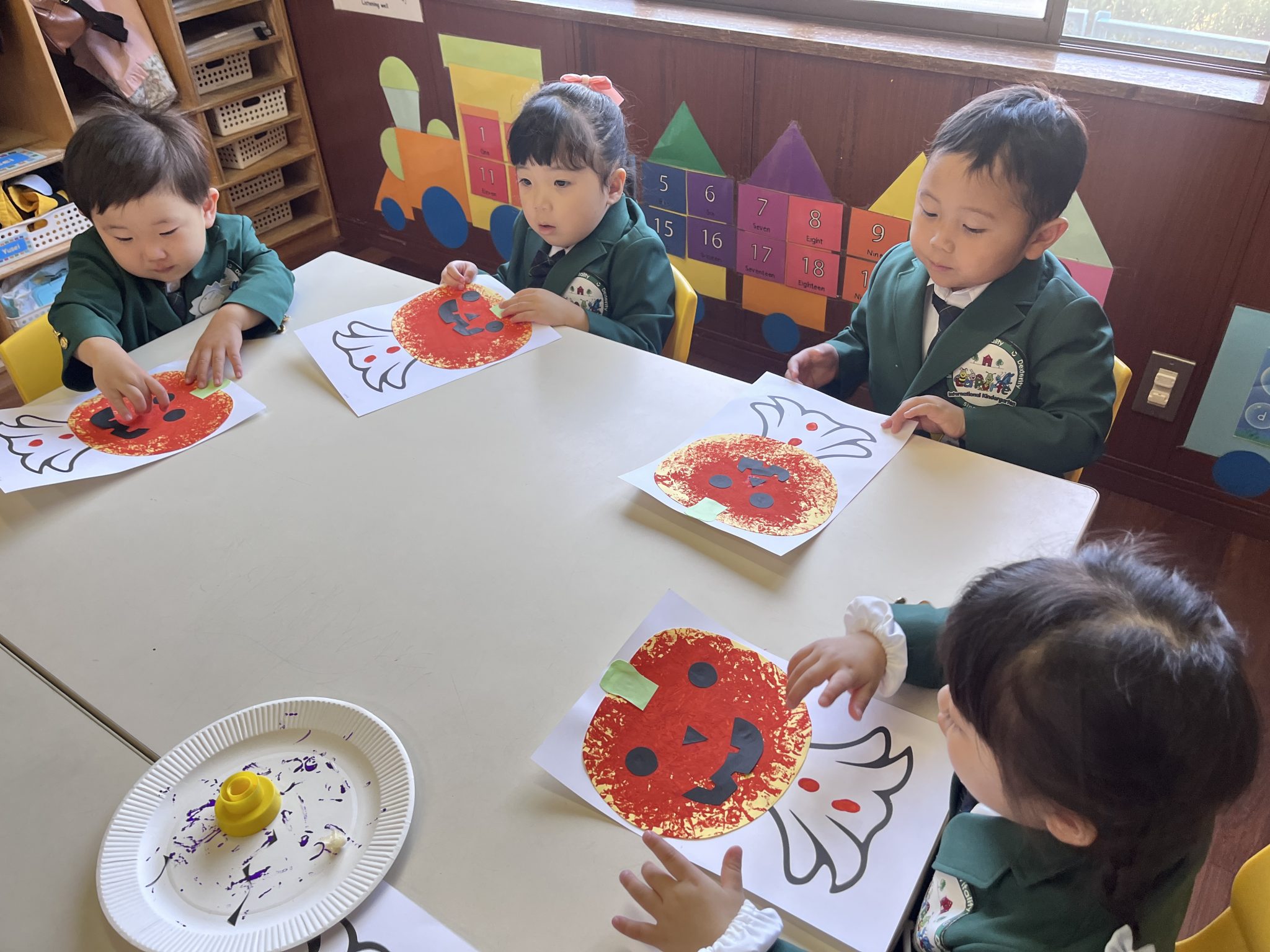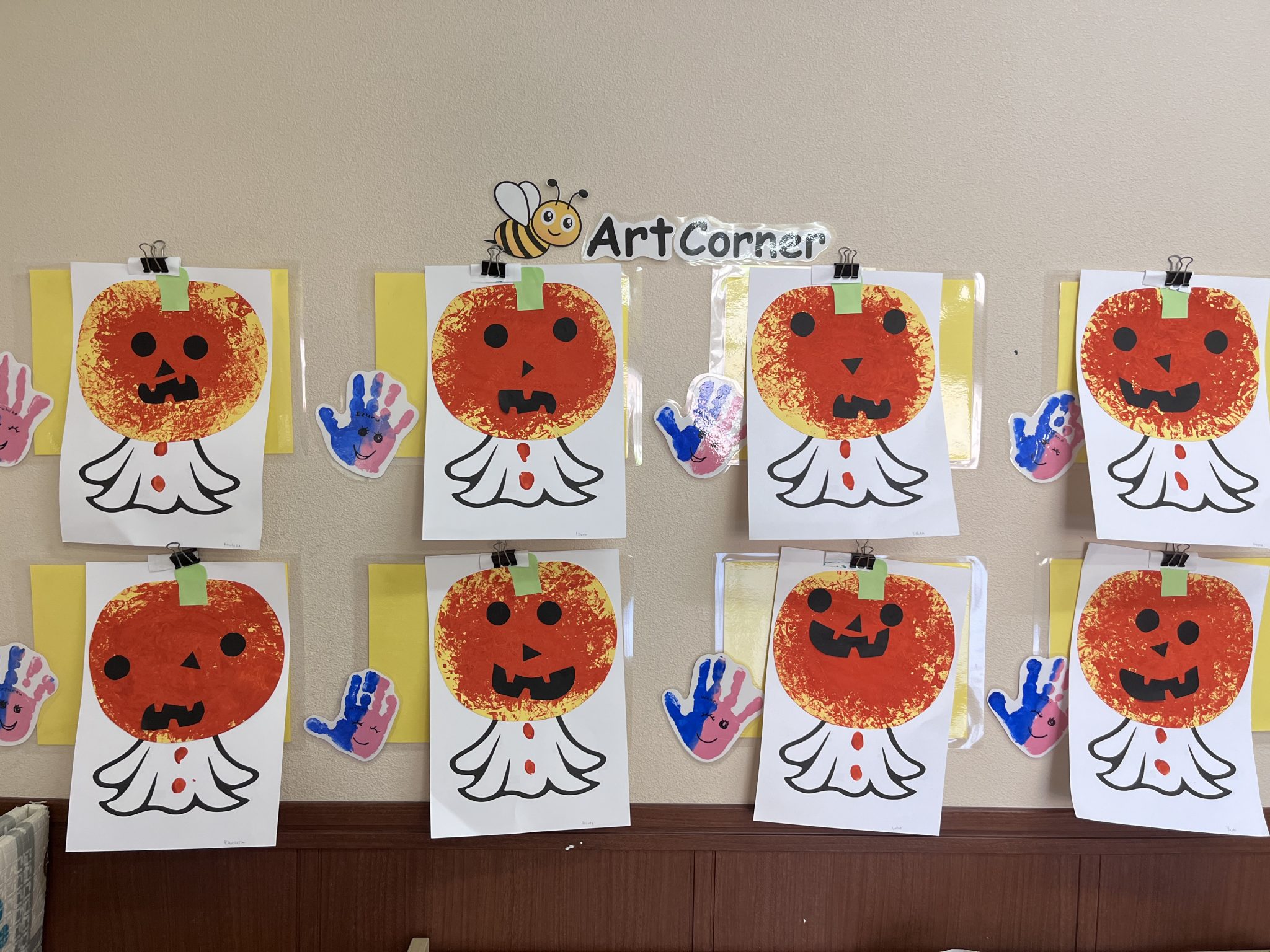 It was a successful Halloween party we had last week! We carved pumpkin jack-o’-lanterns with triangle eyes and made monster and pumpkin art. We had so much fun wearing our cute and BOOtiful costumes and playing lots of Halloween games.We also made it through the witch maze. It was scary at first, but we conquered it with the BBA.We even got stickers from the piñata mummy that we successfully broke, and of course, we brought home some Halloween sweets that we were so excited to eat!
