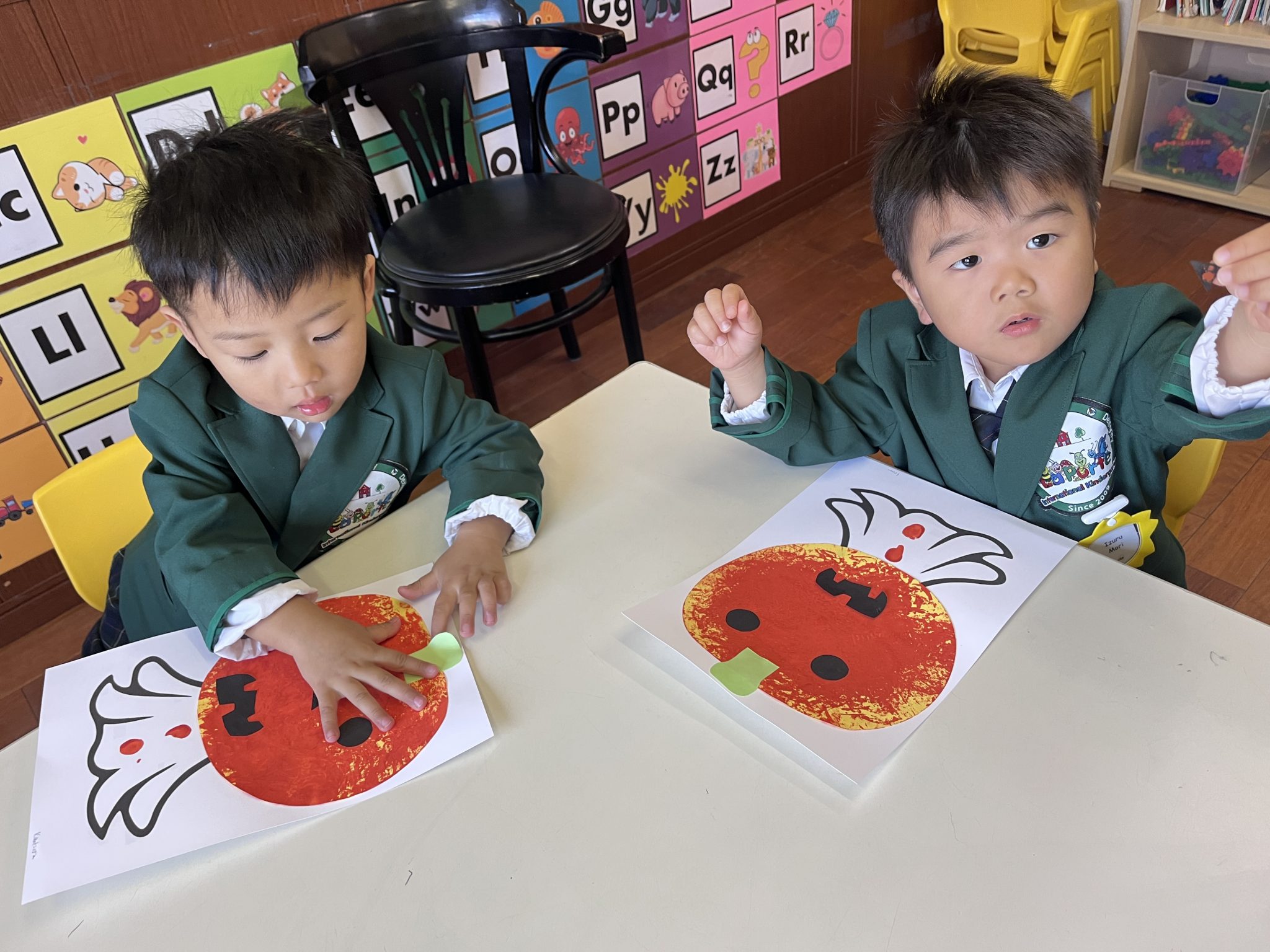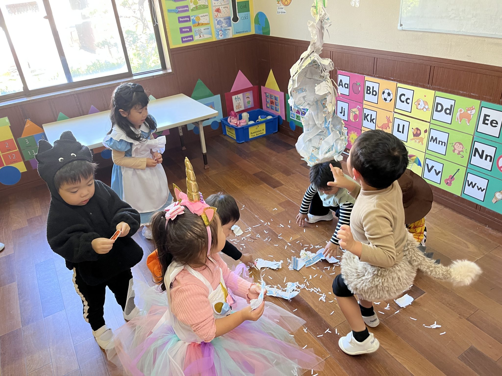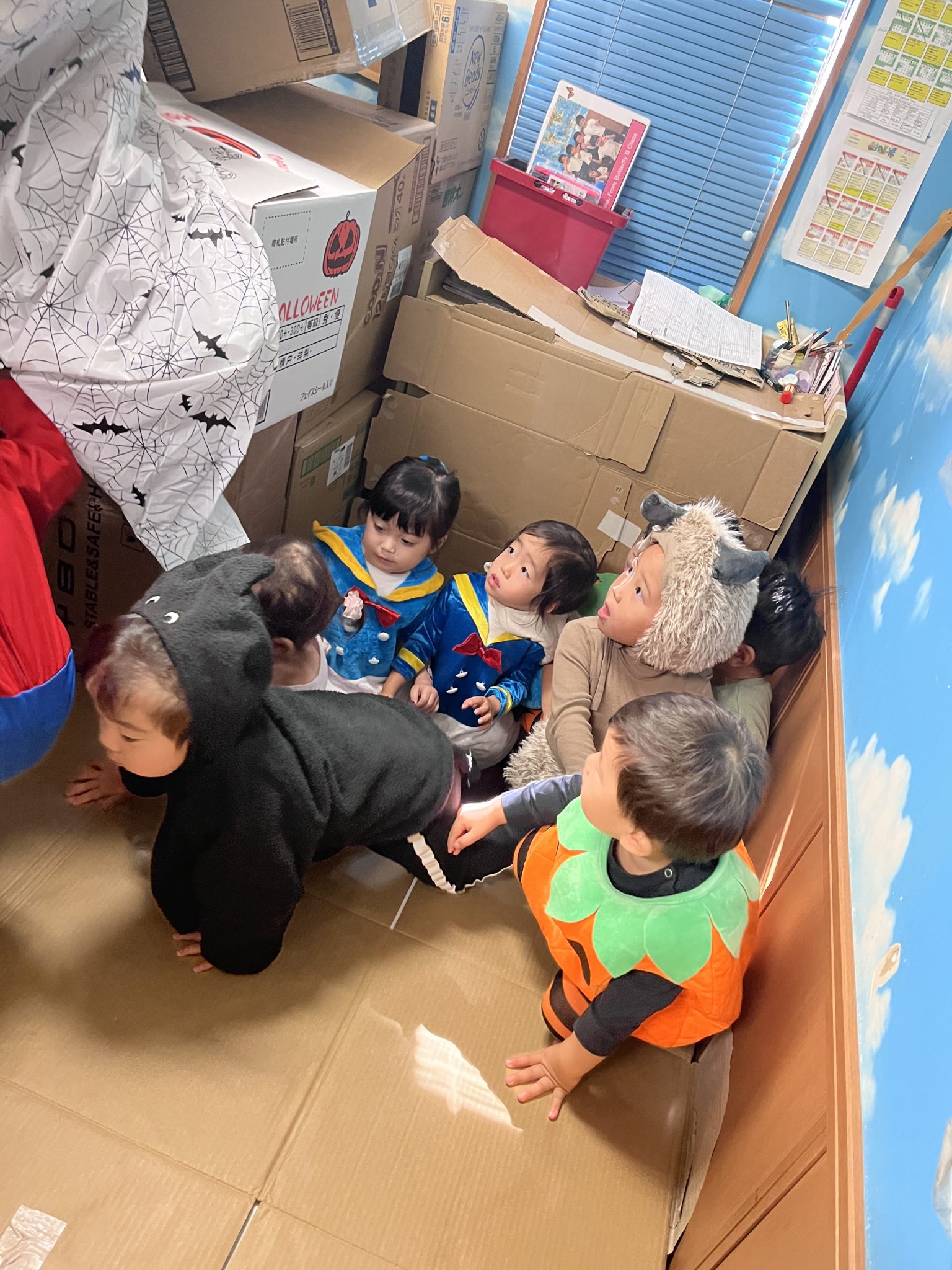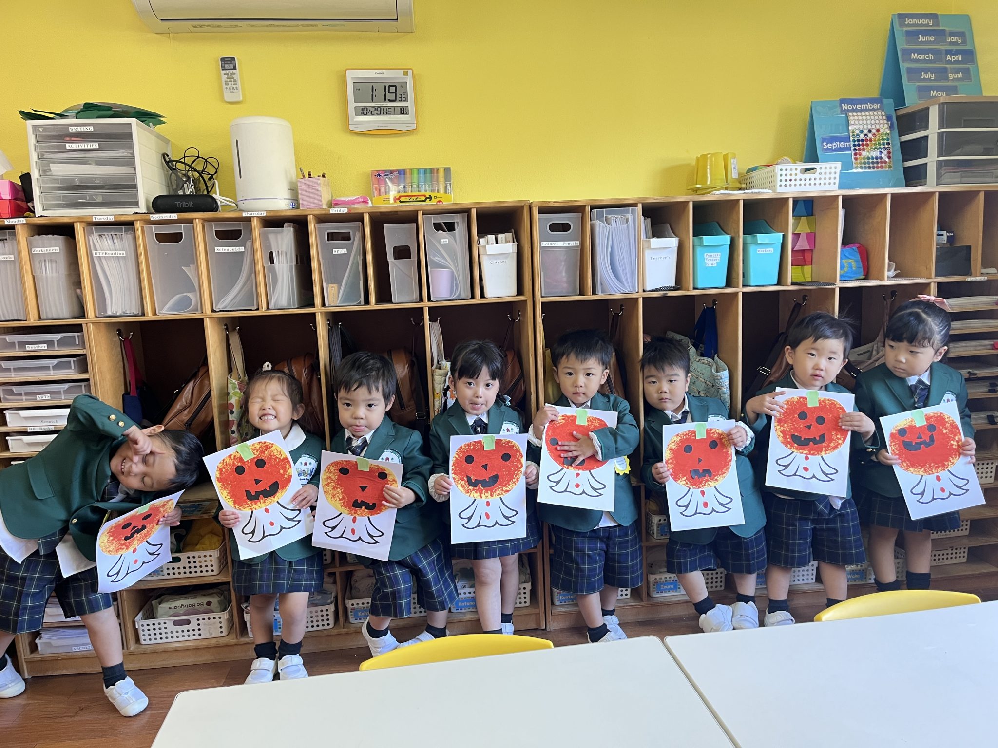 It was a successful Halloween party we had last week! We carved pumpkin jack-o’-lanterns with triangle eyes and made monster and pumpkin art. We had so much fun wearing our cute and BOOtiful costumes and playing lots of Halloween games.We also made it through the witch maze. It was scary at first, but we conquered it with the BBA.We even got stickers from the piñata mummy that we successfully broke, and of course, we brought home some Halloween sweets that we were so excited to eat!