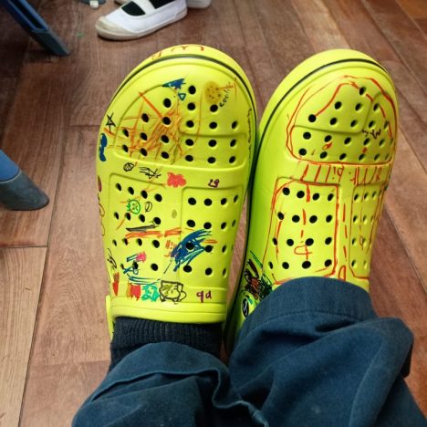 I (William) got new indoor shoes today, and let the butterfly A students decorate them for me. Mr. Colin isn’t here today.