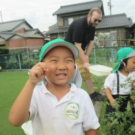 With summer in full swing and our garden blooming it was a good day for our Ladybugs to go vegetable picking. We took turns gathering green peppers and eggplants to take home…