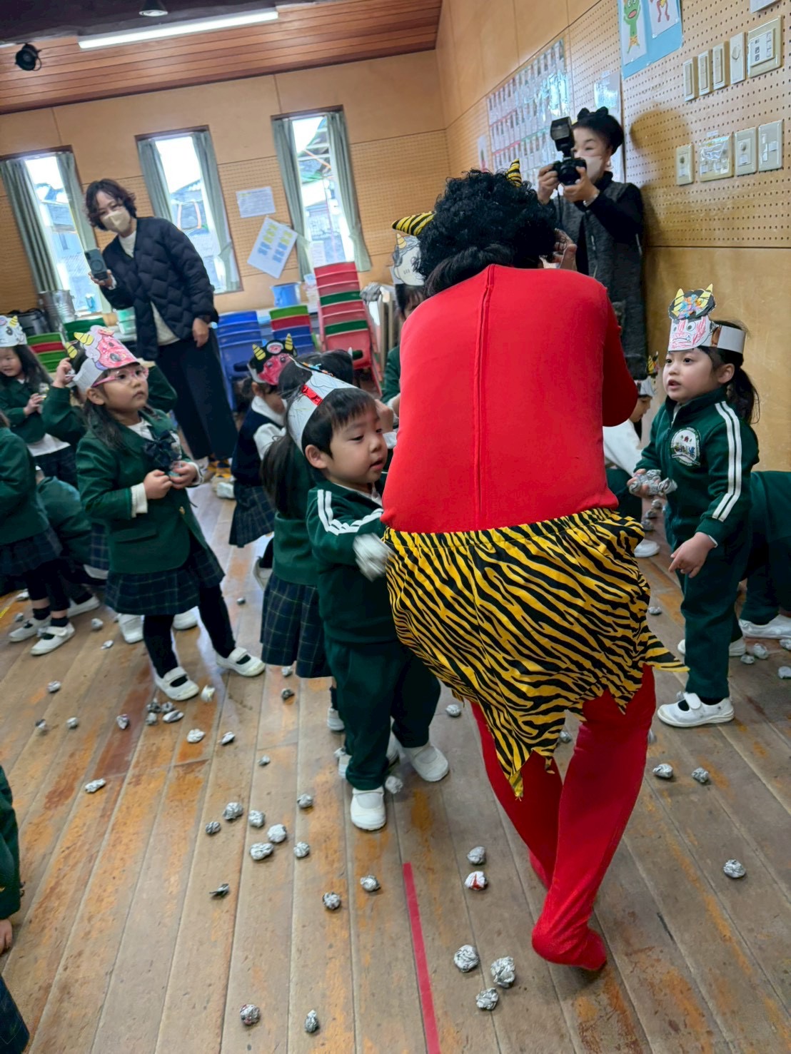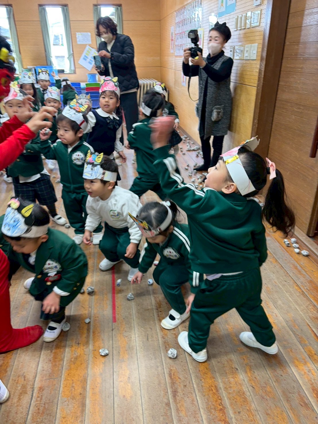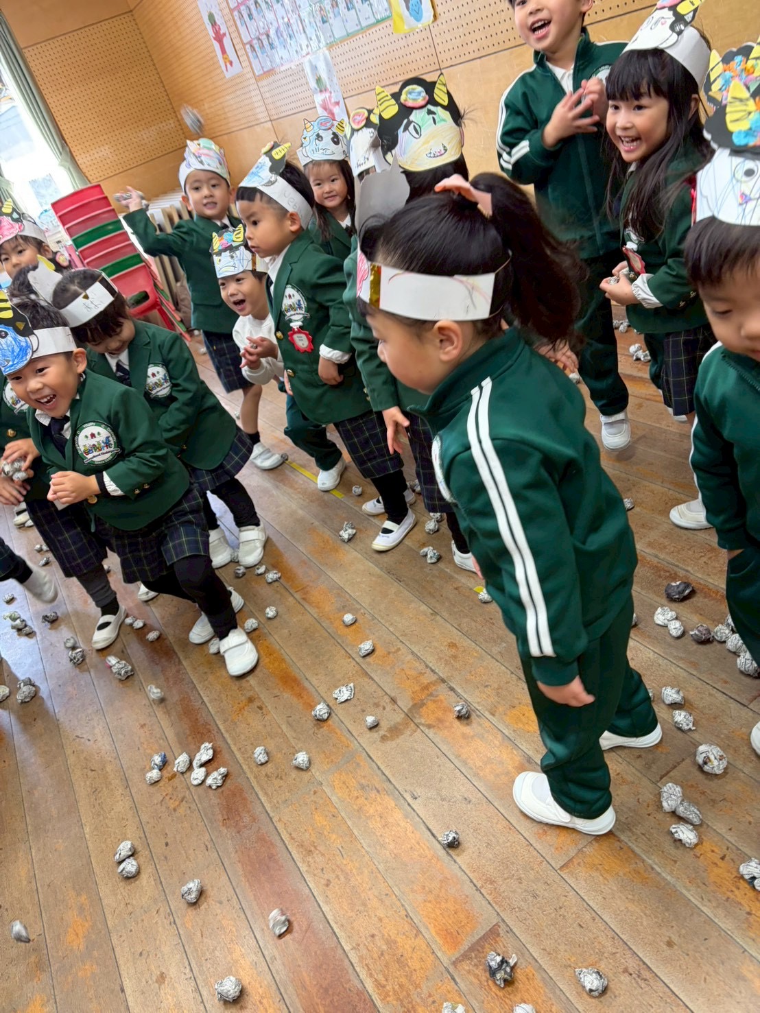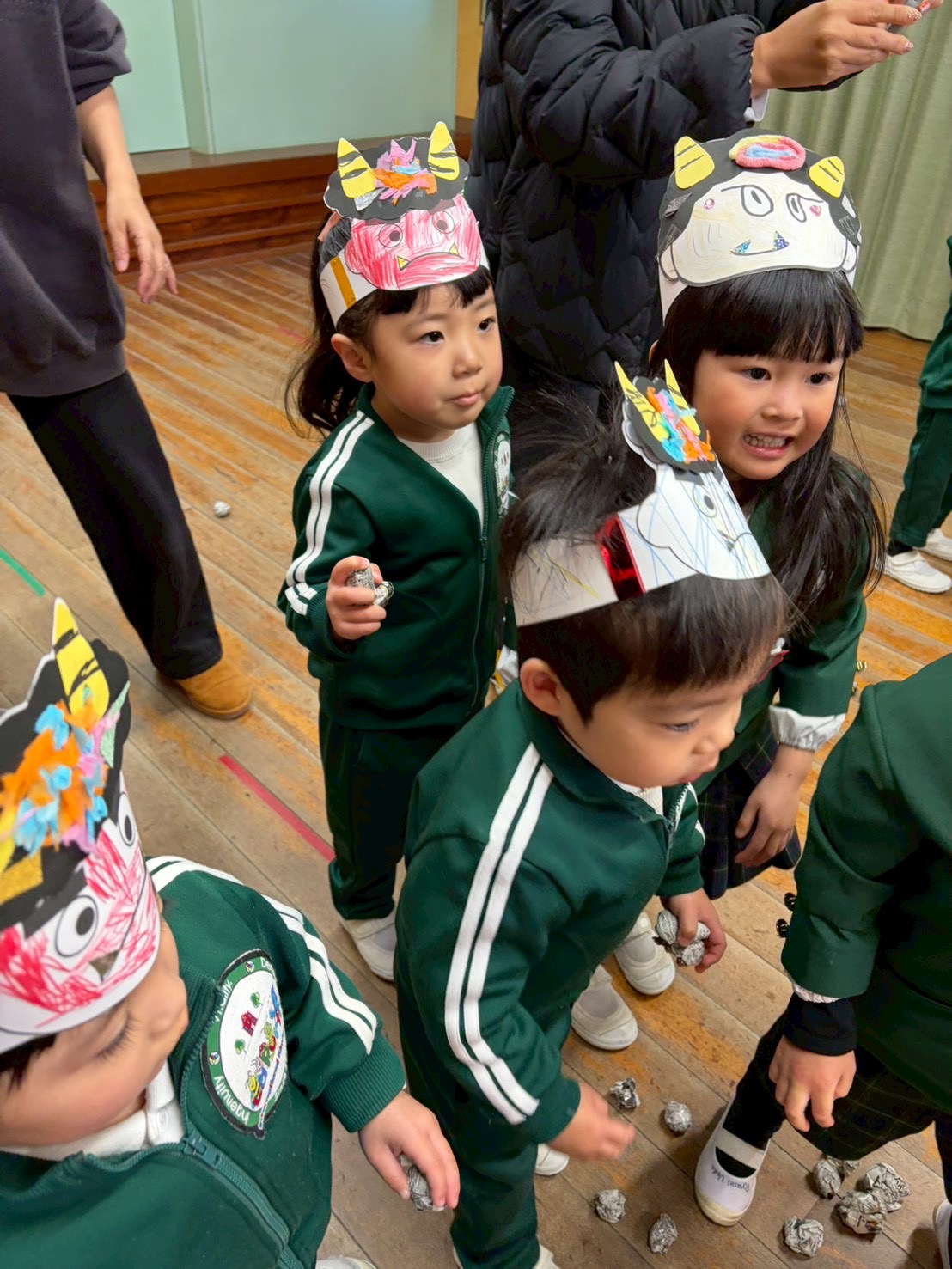 We celebrated Setsubun at school in a fun and safe way. We wore the oni headdresses we made in the classroom. On the day, we used paper balls to throw at the oni. We enjoyed shouting and chasing the oni away while learning about being brave and inviting good things. It was a joyful and exciting day for everyone.