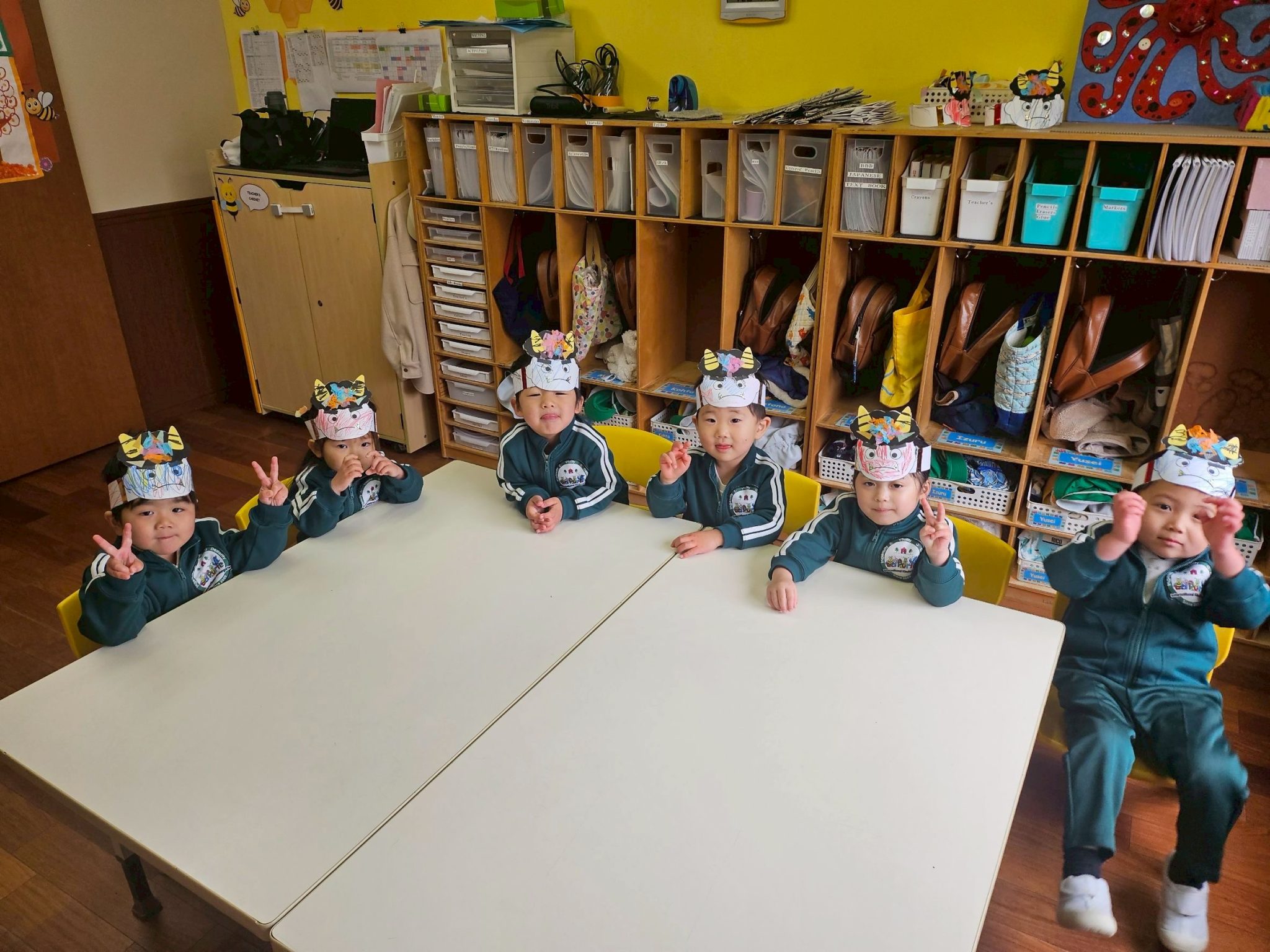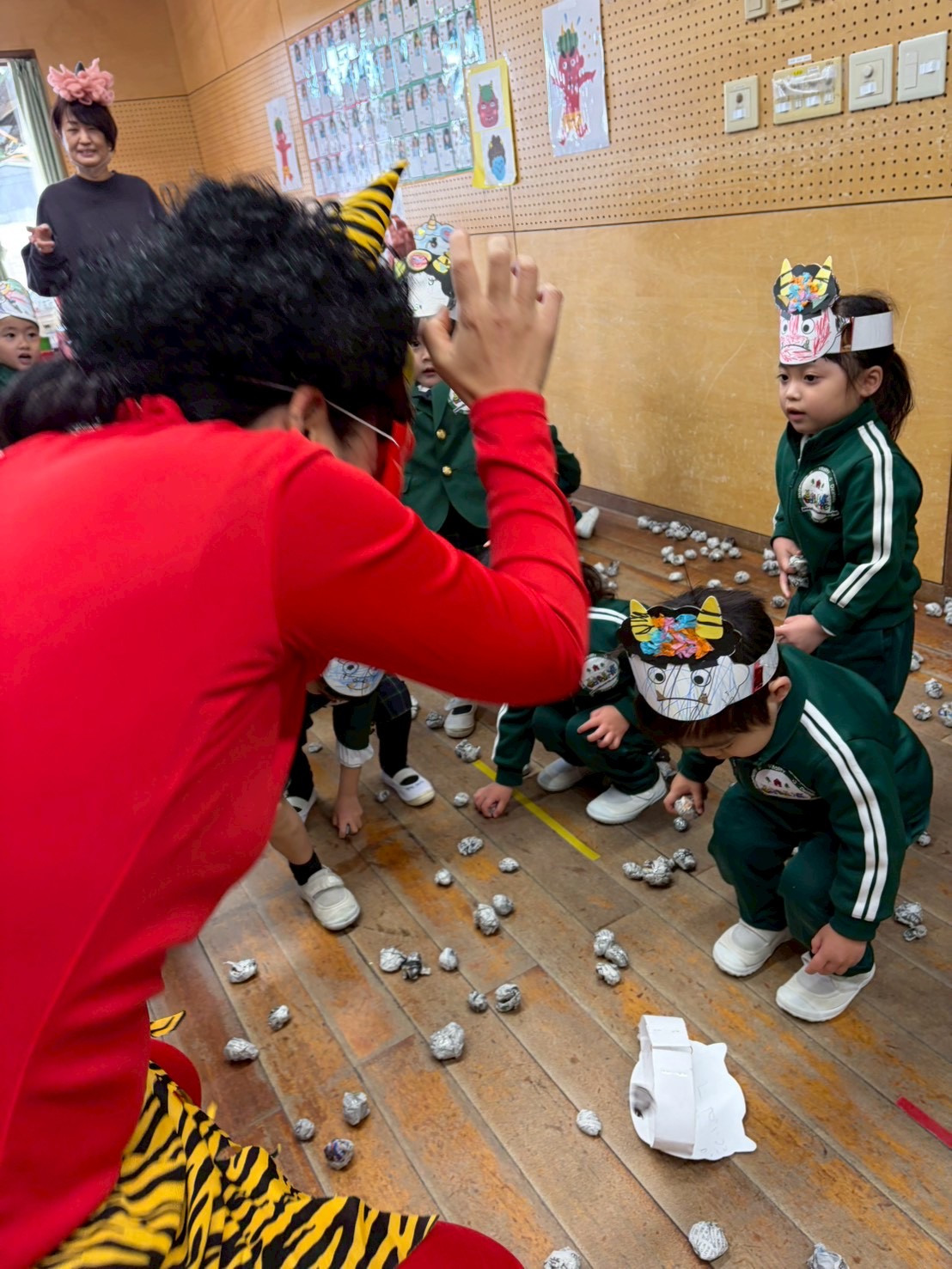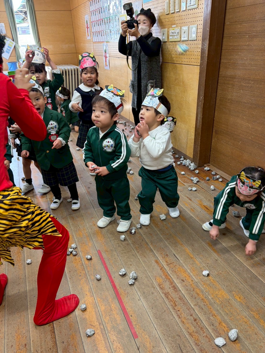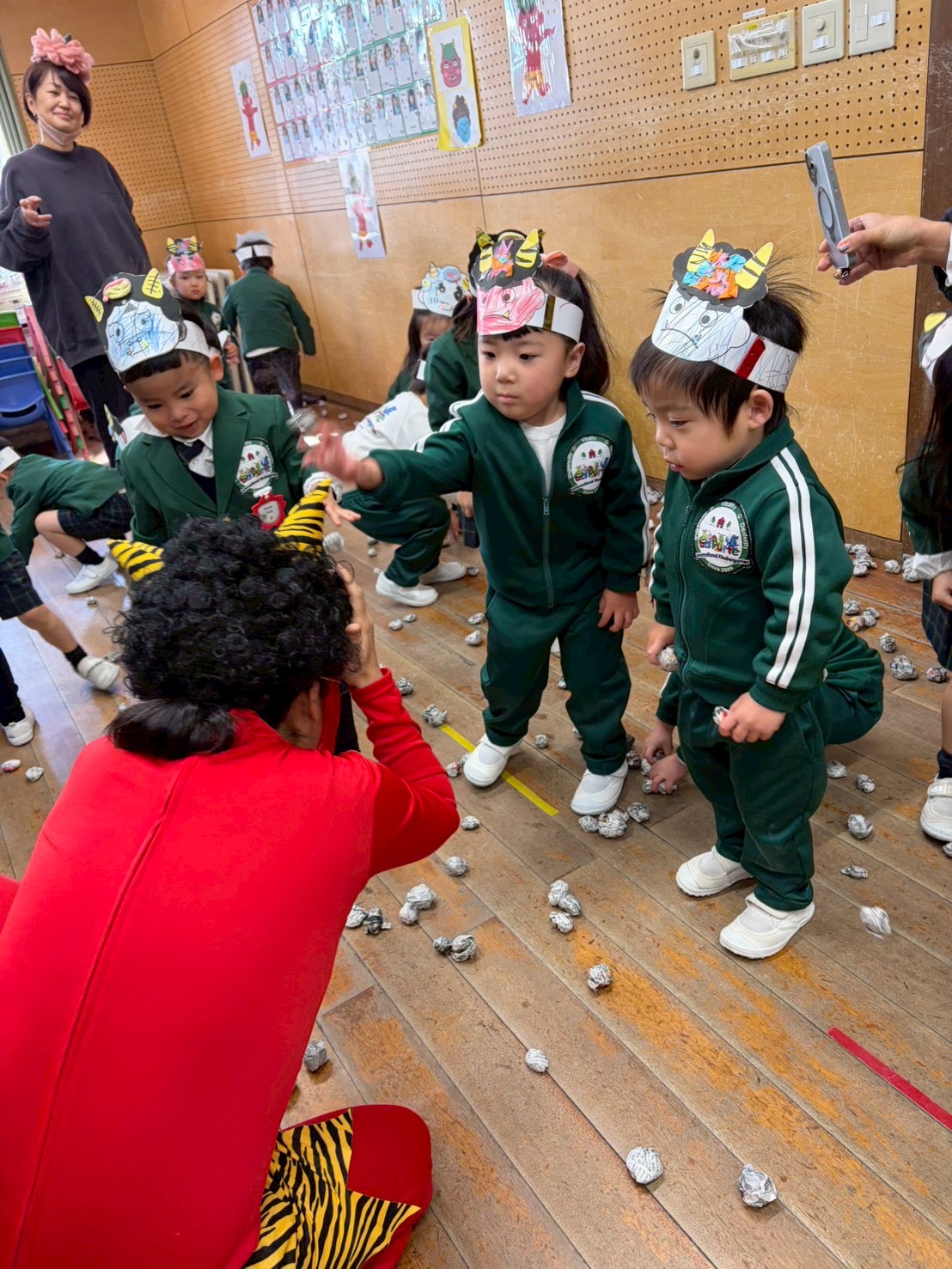We celebrated Setsubun at school in a fun and safe way. We wore the oni headdresses we made in the classroom. On the day, we used paper balls to throw at the oni. We enjoyed shouting and chasing the oni away while learning about being brave and inviting good things. It was a joyful and exciting day for everyone.
