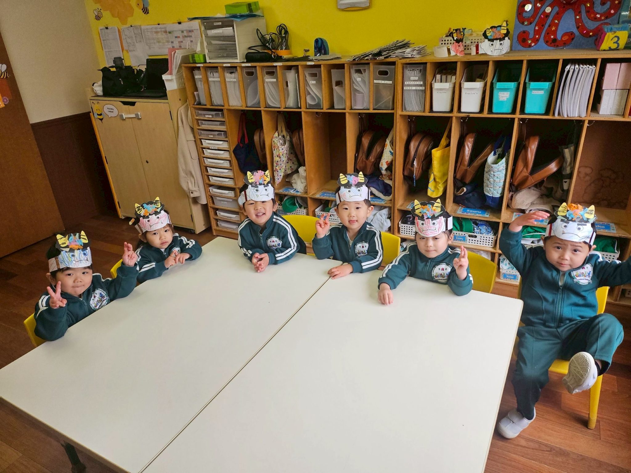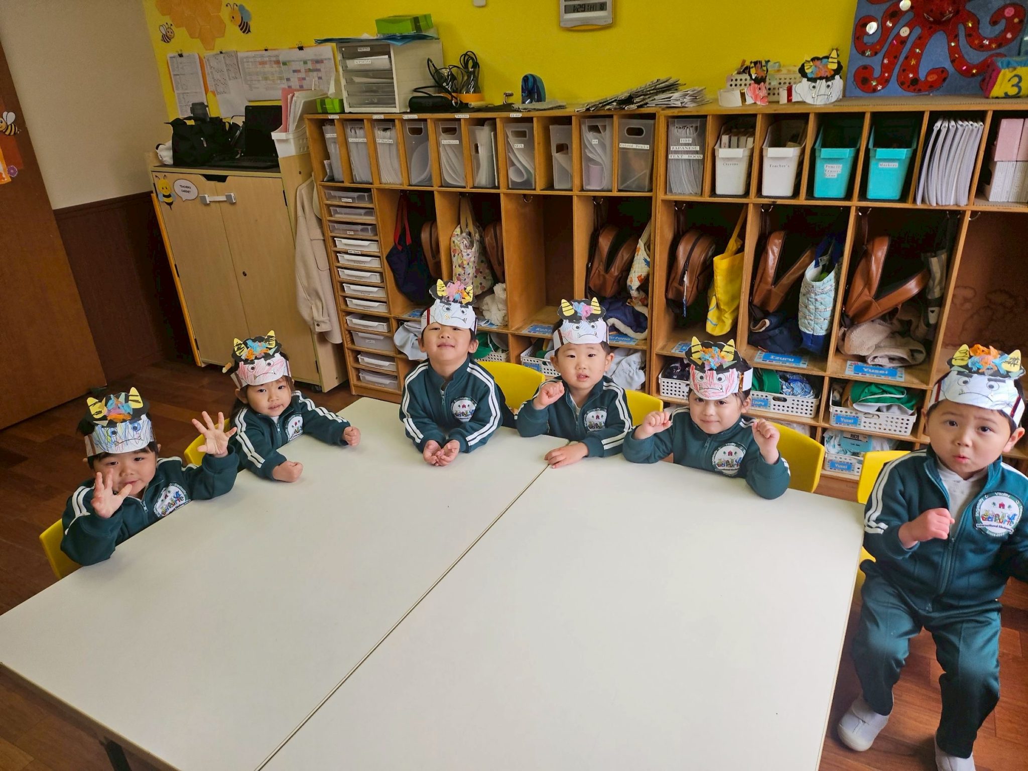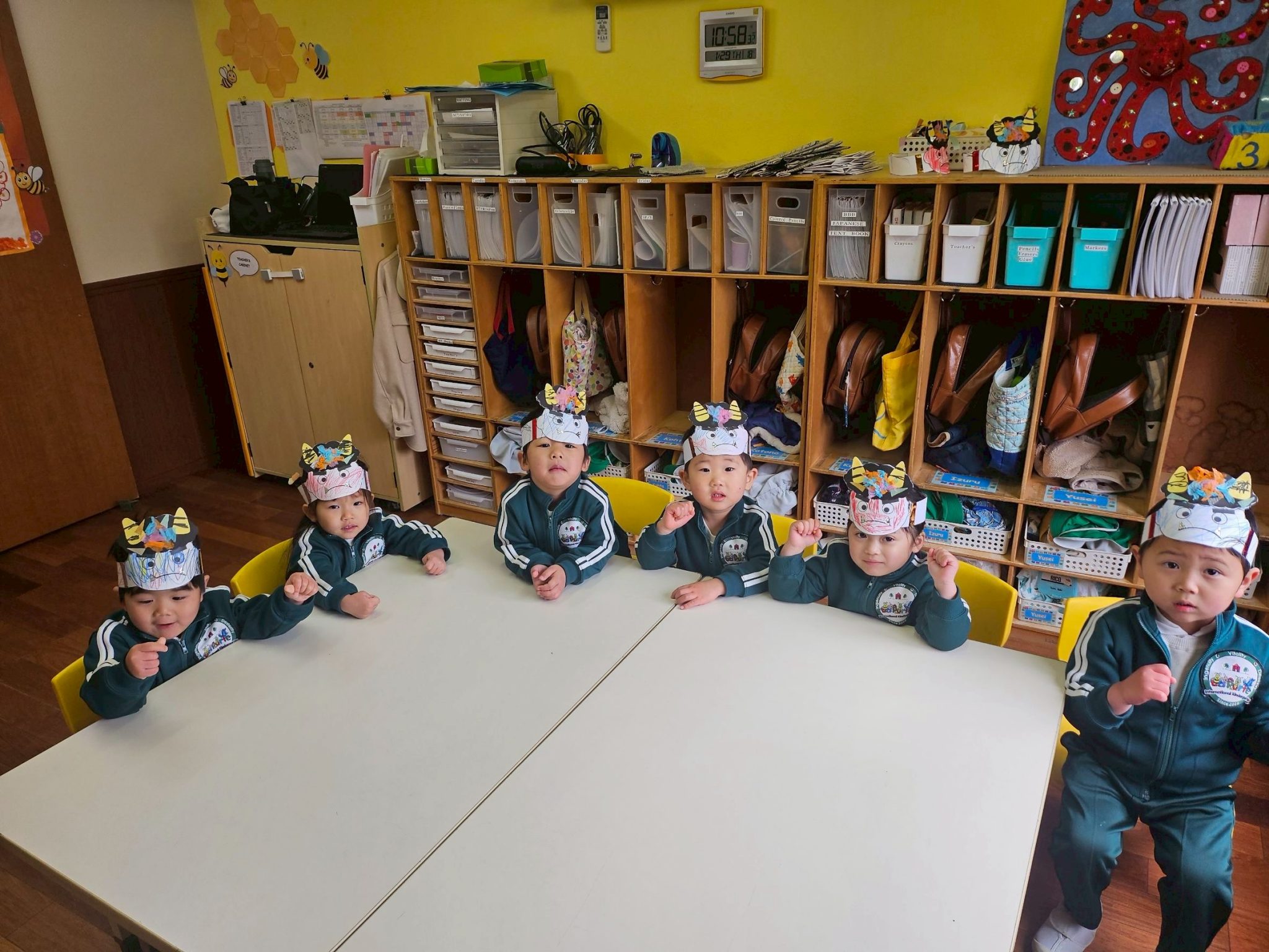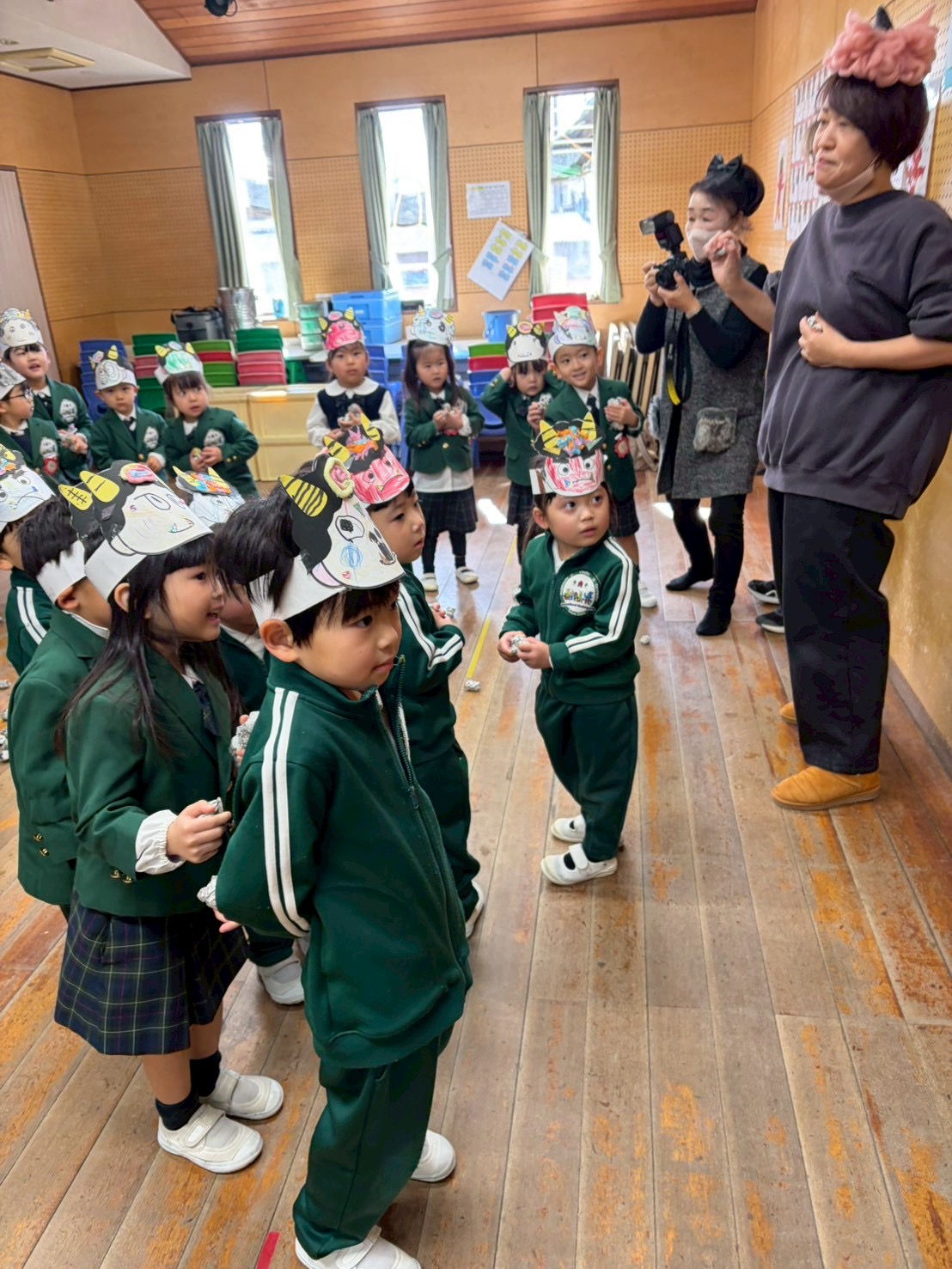 We celebrated Setsubun at school in a fun and safe way. We wore the oni headdresses we made in the classroom. On the day, we used paper balls to throw at the oni. We enjoyed shouting and chasing the oni away while learning about being brave and inviting good things. It was a joyful and exciting day for everyone.