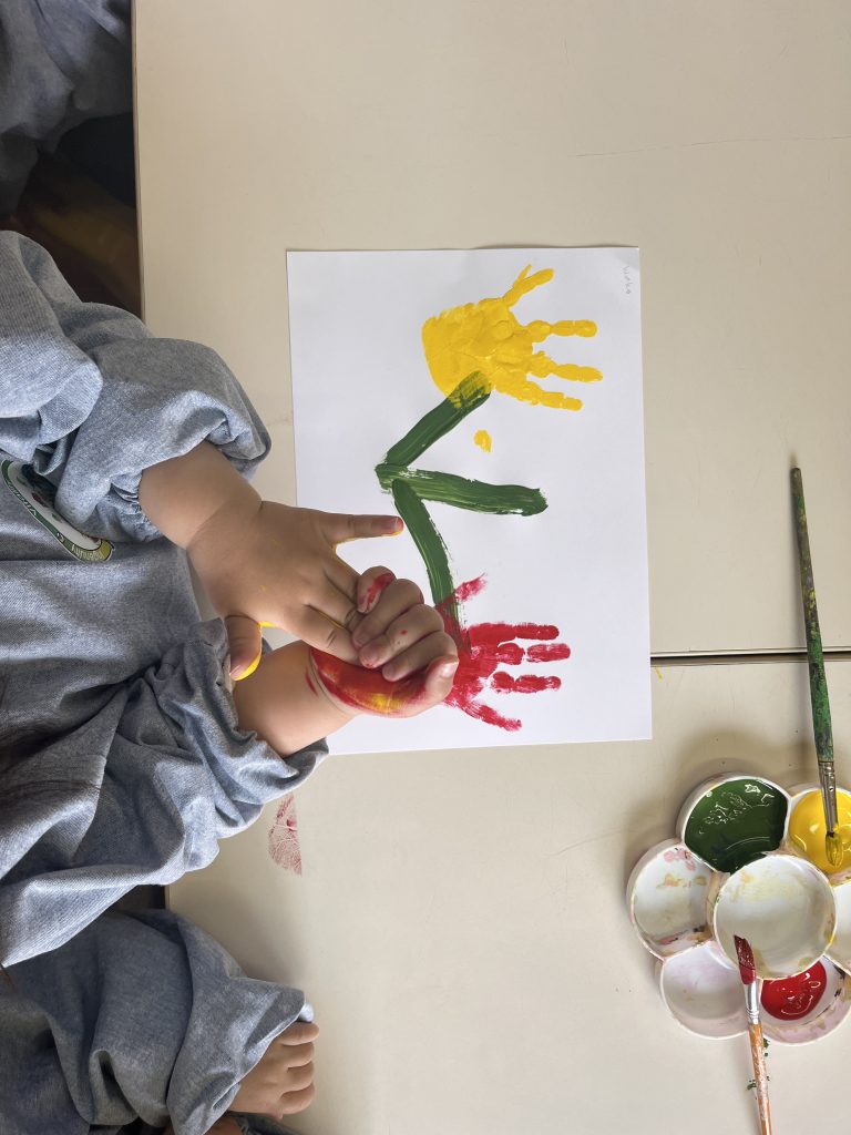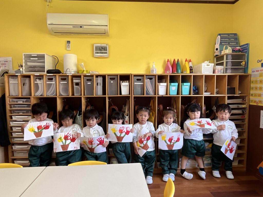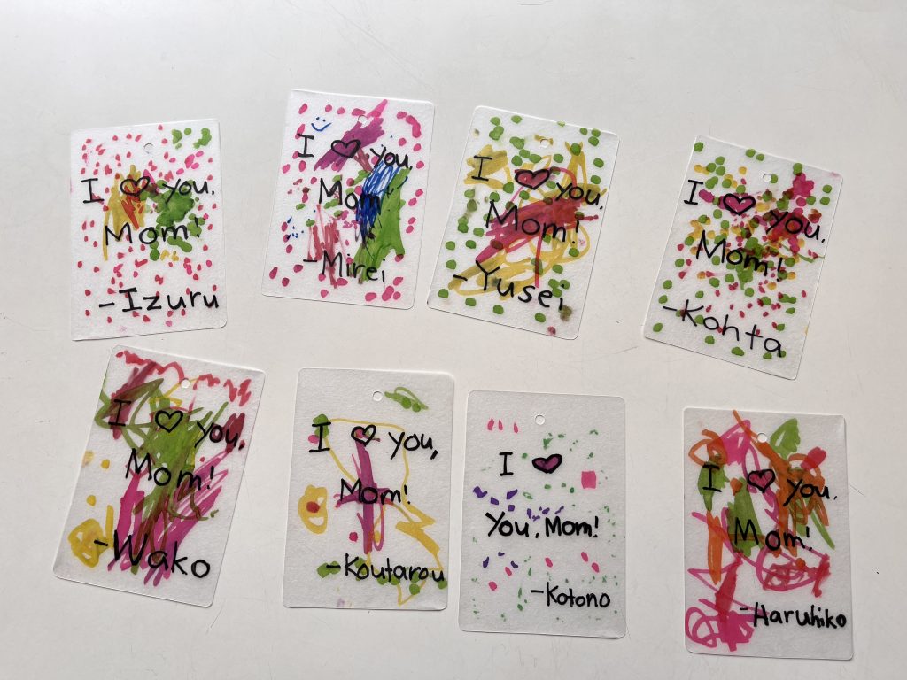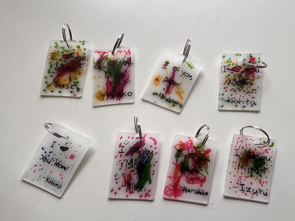 We made something special for our moms—something that will make them happy because we created it just for them. We made keychains that had to be baked to become real keychains. It was like magic—they shrank down to mini sizes! We were so surprised! We also made cards for them using our colorful handprints. It was so much fun!