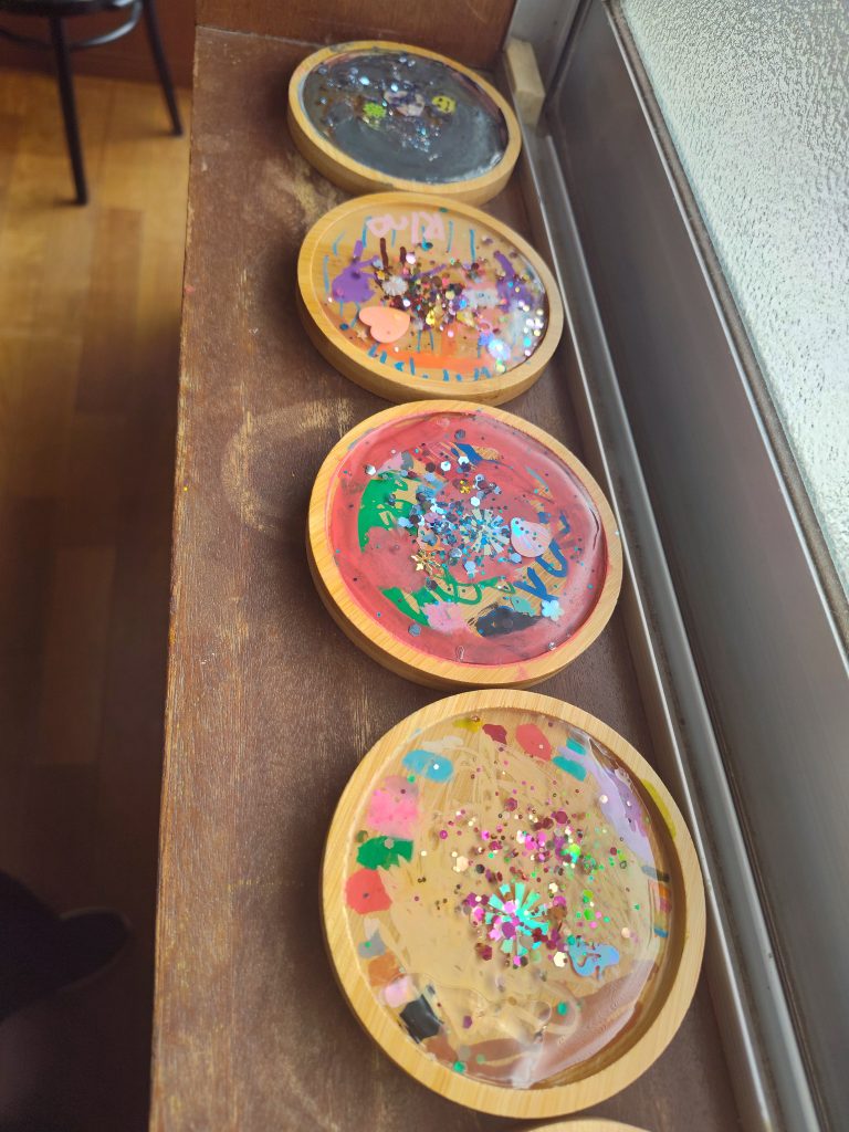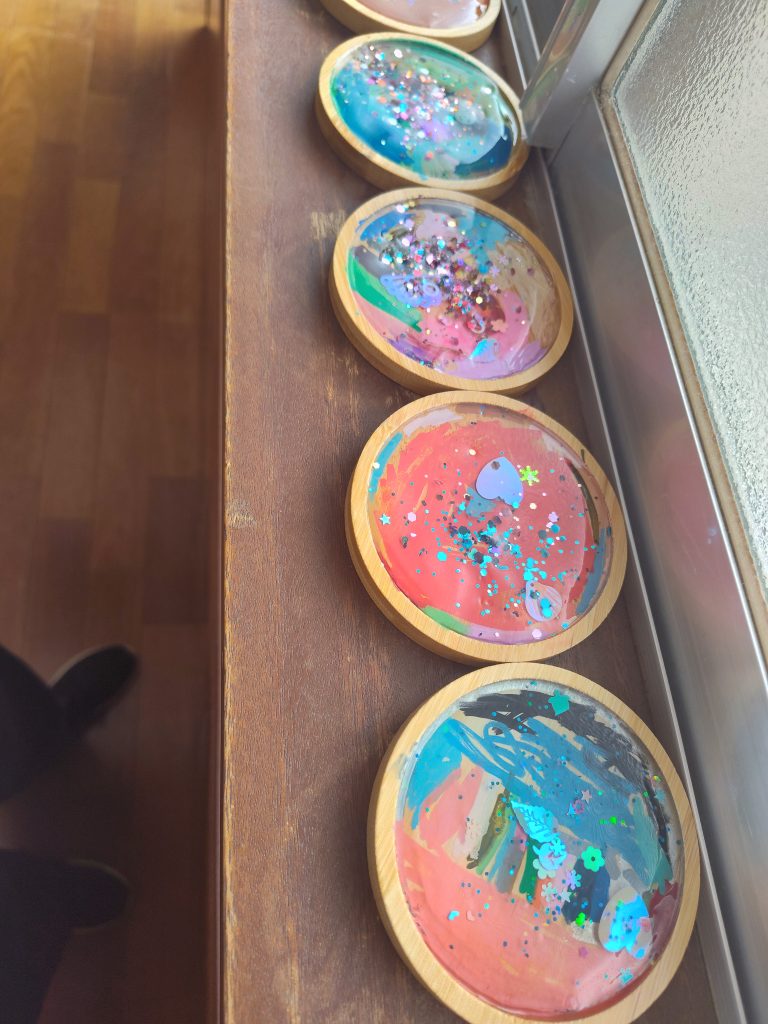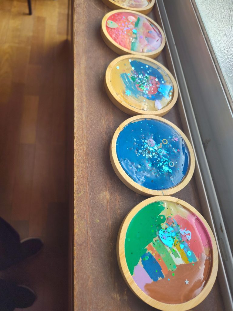 Recently Ladybug A got to make some fun coasters for their grandparents. They got to design a pattern in the bottom and pick out fun glitter and sparkles to go inside. They turned out great and everyone had fun showing their friends what they made!