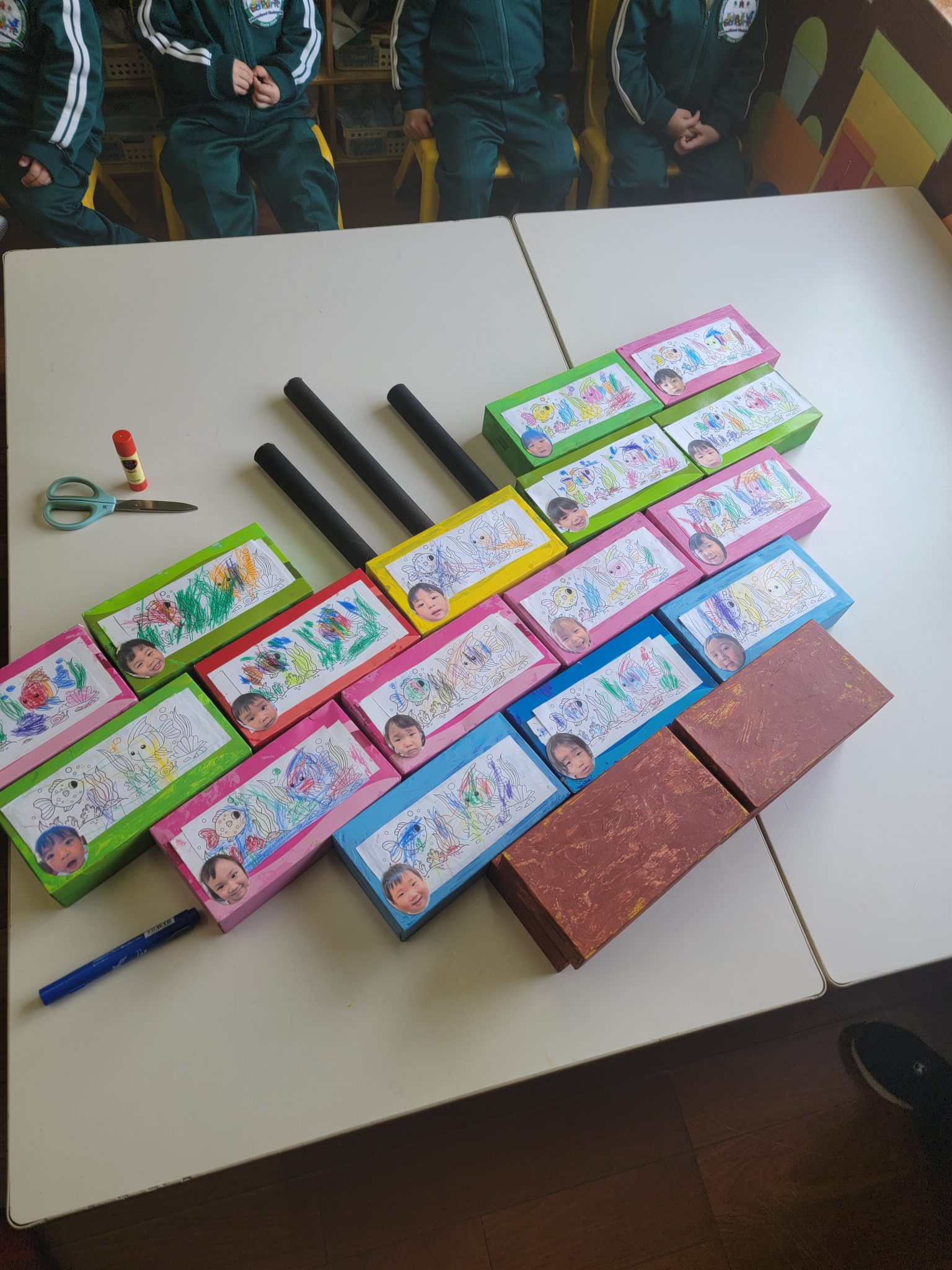 Our Bumblebee art project is also finished, we made an aquarium and a boat!